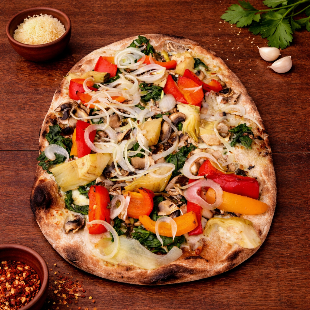 Pinsa bianca (auf wunsch mit Tomatensauce) mit Büffel-Mozzarella, geglilltes gemischtes Gemüse und Peperoni.