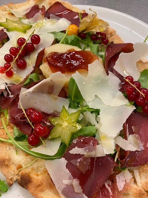 Pinsa bianca (auf wunsch mit Tomatensauce) mit Büffel-Mozzarella, Wildschwein-Rohschinken, Rucola und Parmesan-Streifen, garniert mit Früchten.