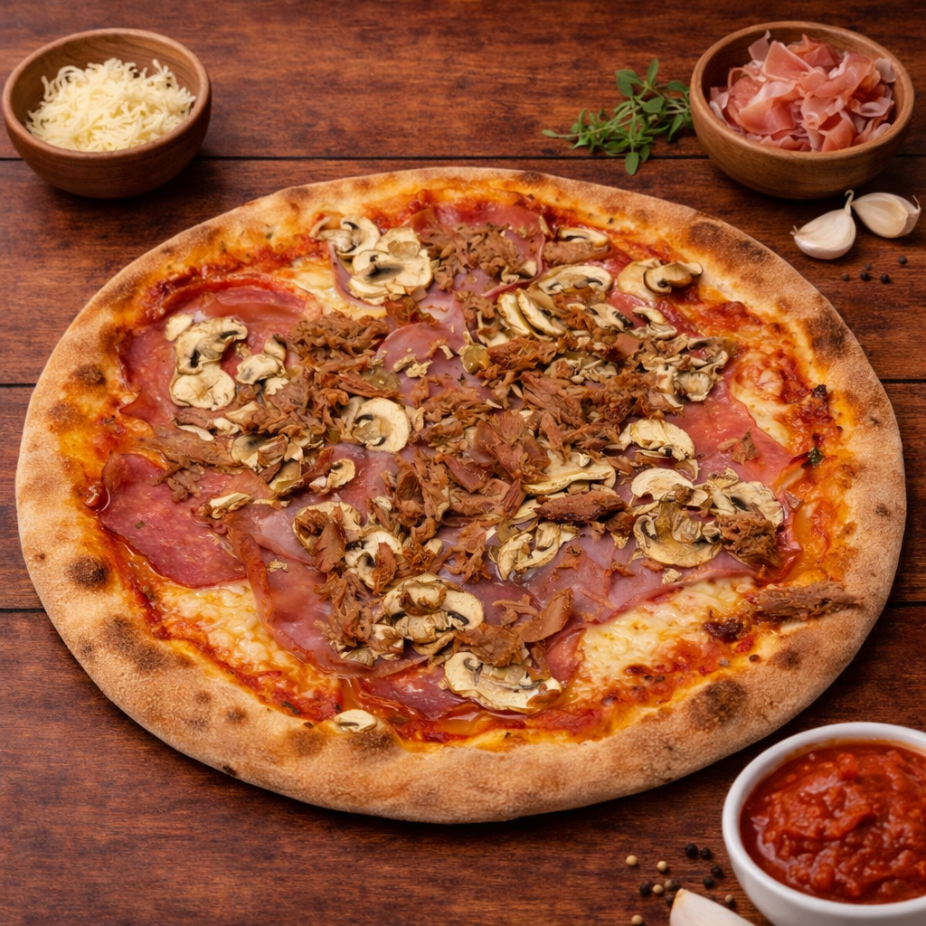 Tomatensauce, Mozzarella, Salami, Schinken, Champignons und Thunfisch.