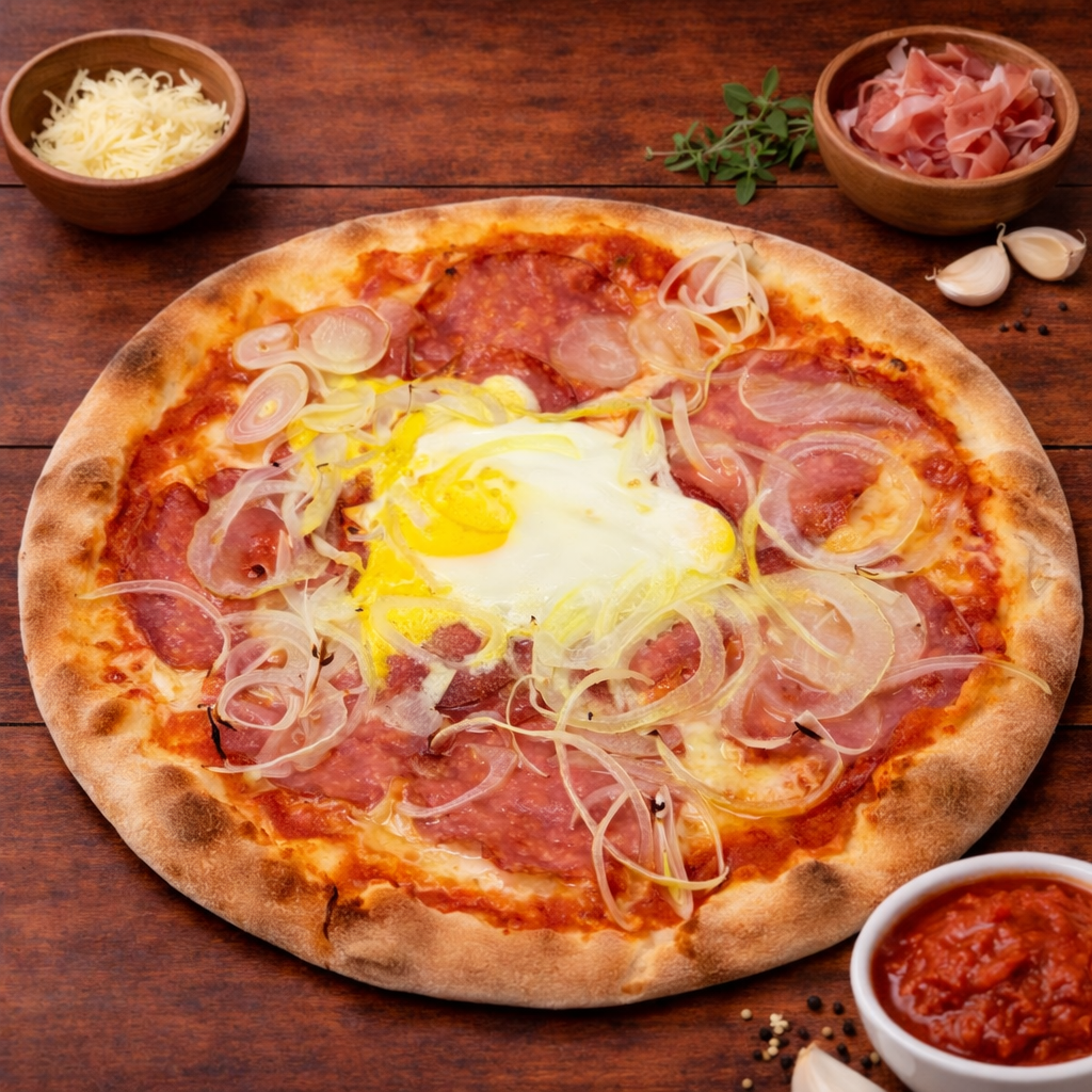 Tomatensauce, Mozzarella, Salami, Ei, Zwiebeln und Knoblauch