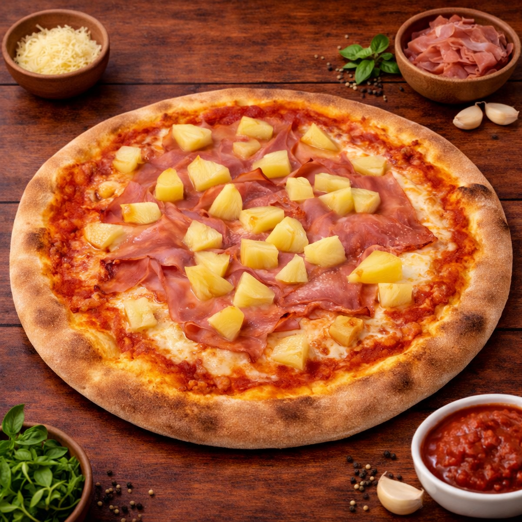 Tomatensauce, Mozzarella, Schinken und Ananas.