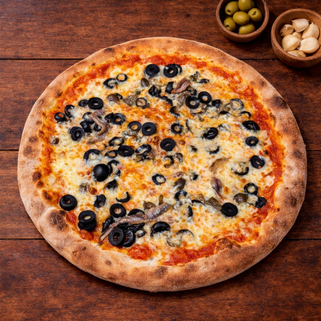 Tomatensauce, Mozzarella, Sardellen, Oliven, Kapern und Knoblauch