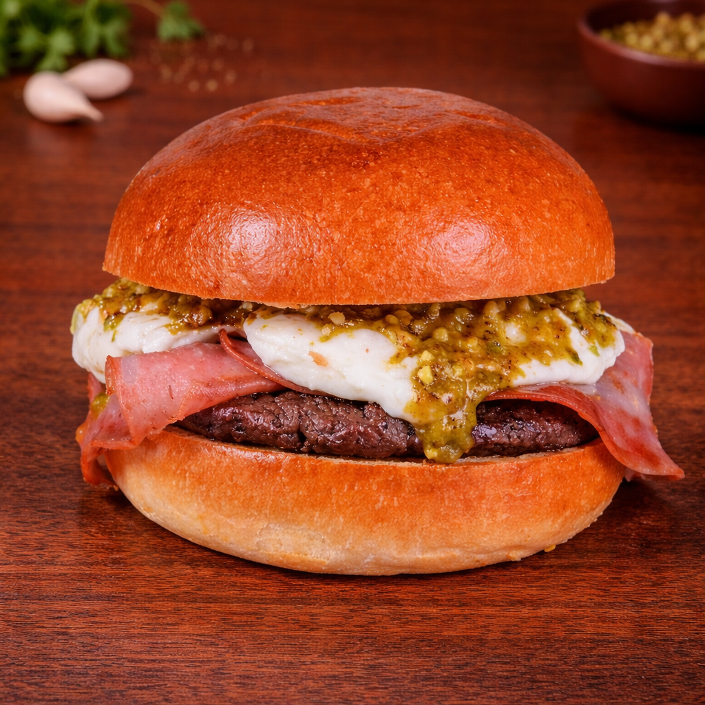 Rindssmashburger (150g) mit Mortadella, Stracciatella (cremige Füllung des Burrata), Pistaziencréme und Pistazienkerne.