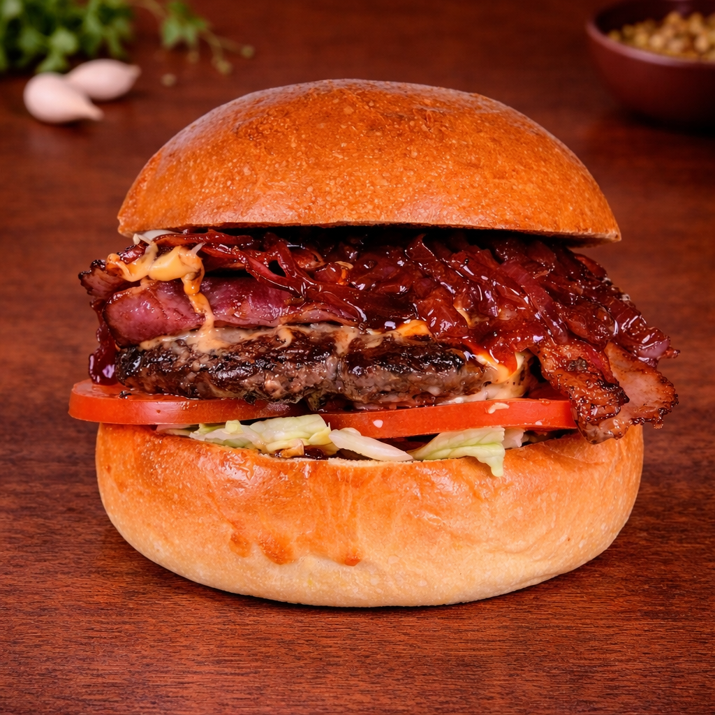 Rindssmashburger (150g) mit Tomaten, Eisbergsalat, Speck, Cheddarkäse, Karamelisierten Zwieben und BBQ Sauce.