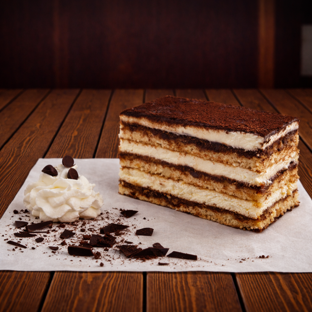 In Kaffeelikör getränkte Bisquit, Mascarpone und Zabaglionecrème und ein Hauch von Kakao.